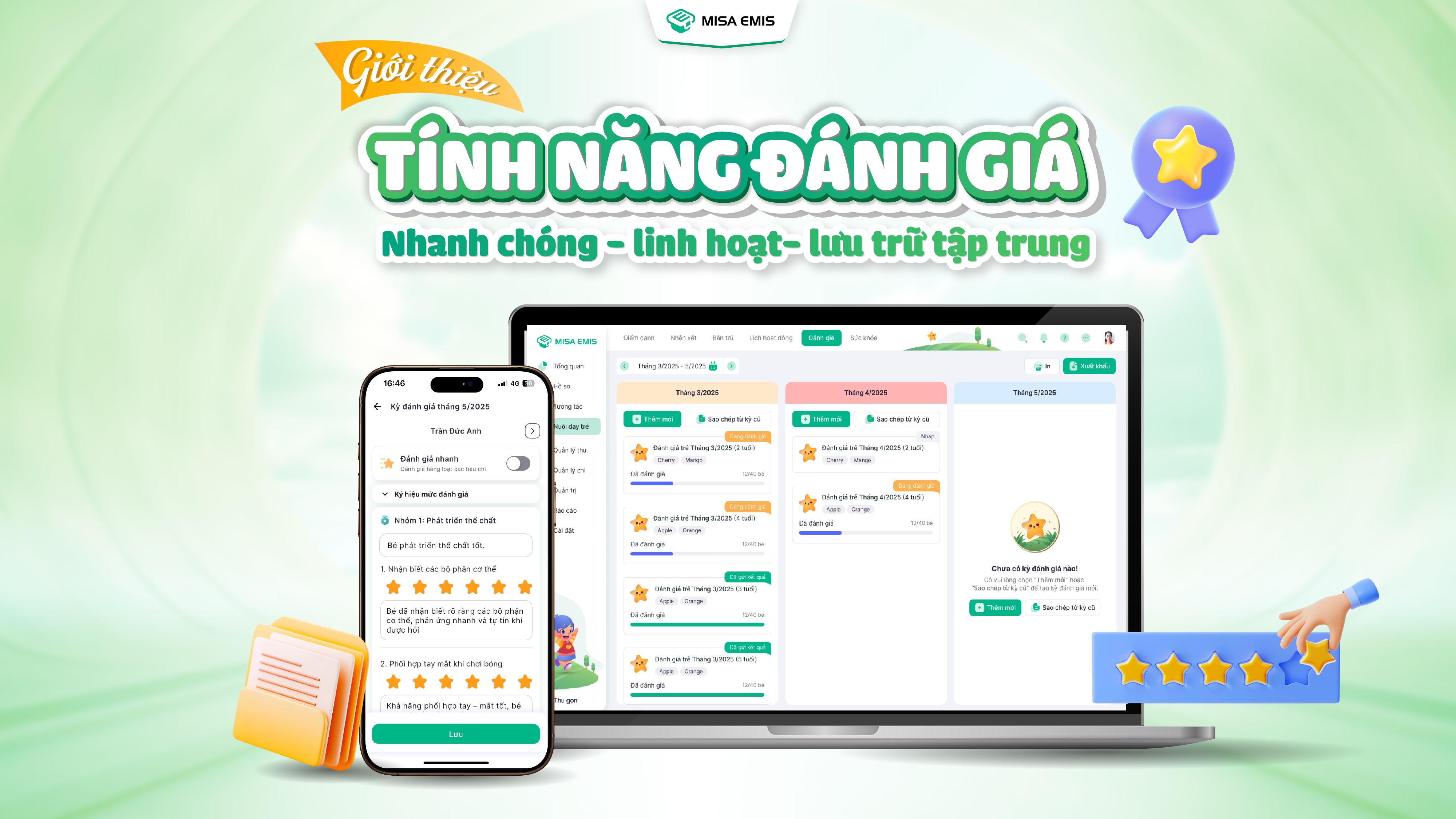 Thấu hiểu điều đó, MISA EMIS ra mắt tính năng Đánh giá – giúp giáo viên hoàn thành chỉ trong 30 phút, tiết kiệm tới 90% thời gian, lưu trữ tập trung và gửi kết quả đến phụ huynh chỉ với vài thao tác.